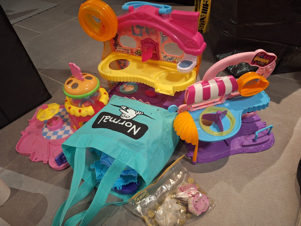 3 taloa ja normal pussukka jossa 3 hamsterit sekä rakennuspalikoita. Hinta 20e koko paketti