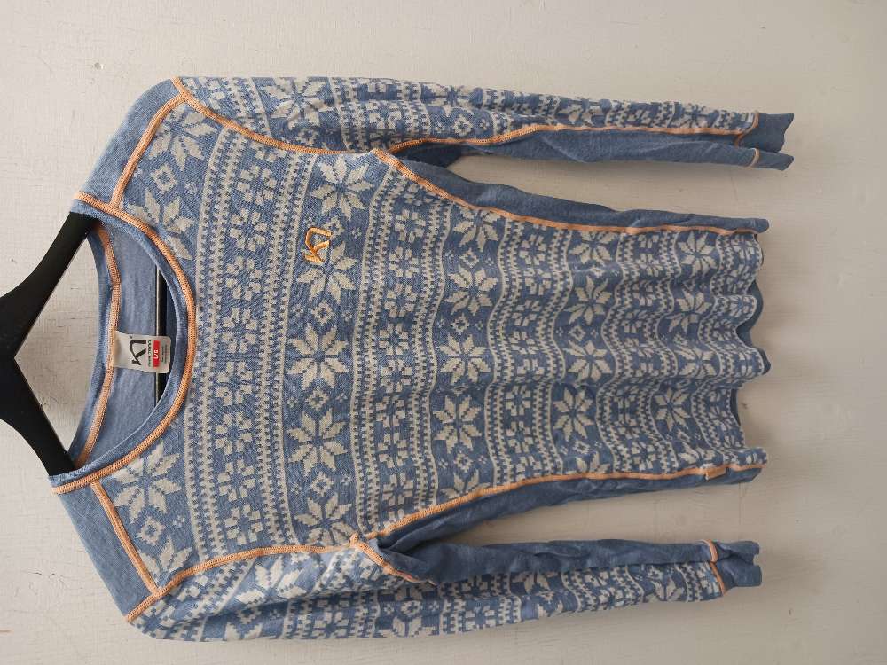 Ohutta neulosta, tummansini-valkoraitainen paita. Koko xs.