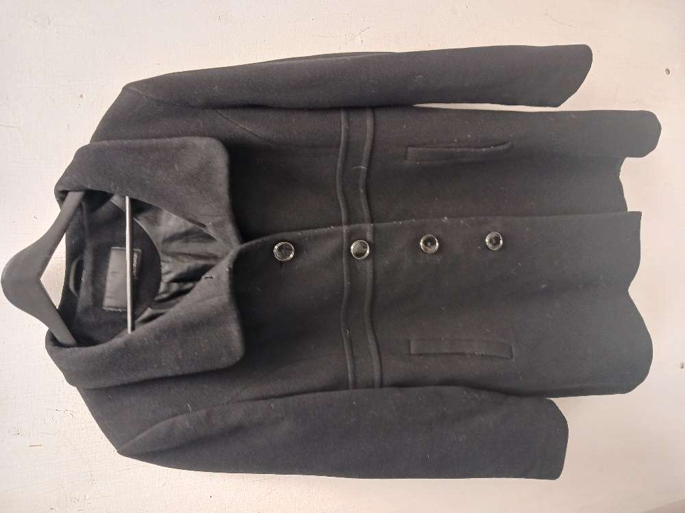 Harmaa, polvipituinen(164cm pitkällä) villakangastakki. Koko 38
