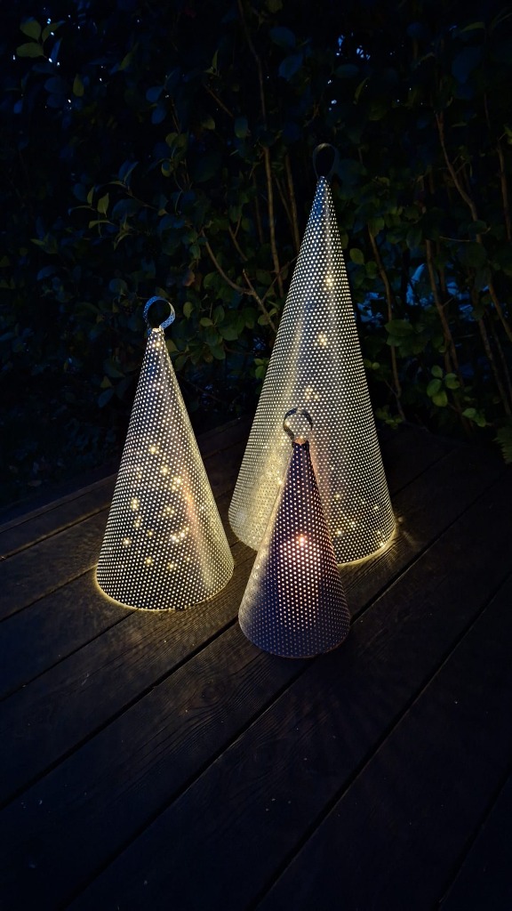 Kolmen metallisen lyhdyn sarja johon voi asettaa kynttilät tai valosarjat. Sopivat käyttöön parvekkeelle, terasille, patiolle tai ihan maavaraisesti. Lyhtyjen korkeudet 38, 51 ja 69 cm ja halkaisijat 18, 25 ja 35 cm. Kuvissa olevat valot eivät kuulu kauppaan.