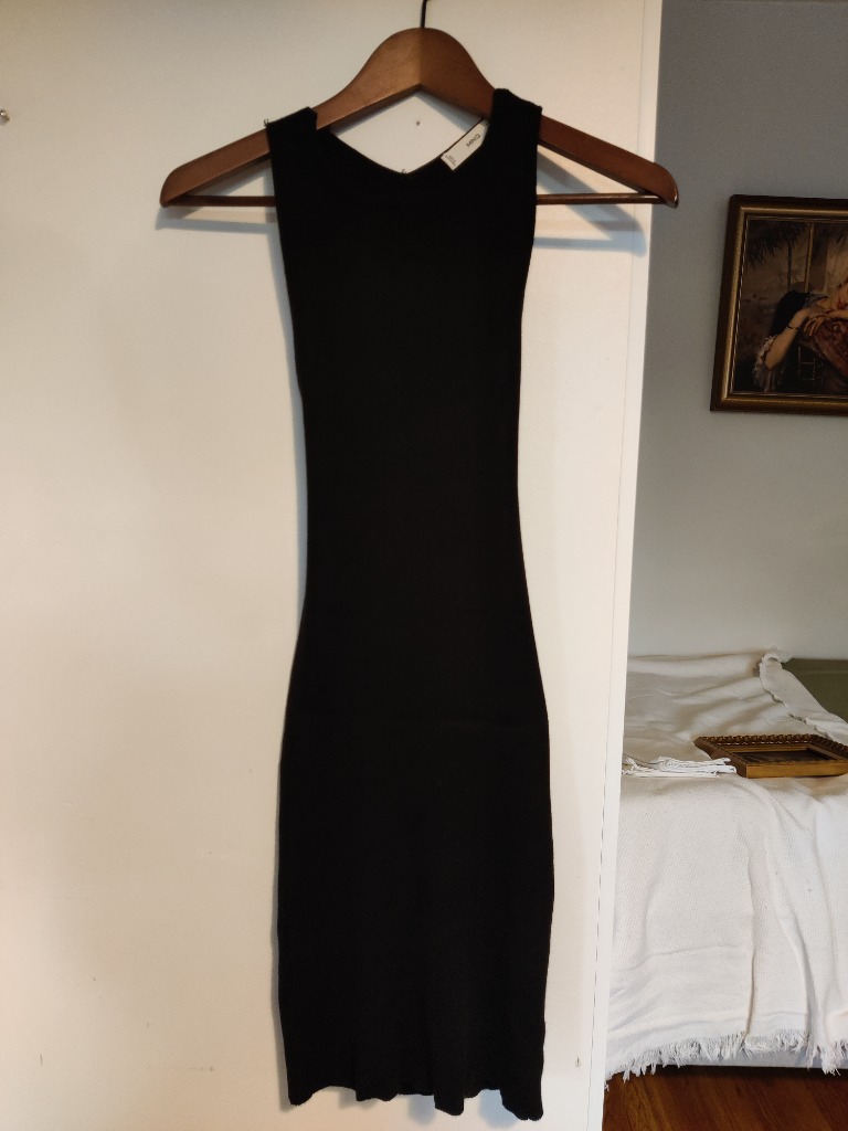 Musta avonaisella selällä oleva neulemateriaalia oleva Mangon kotelomekko koossa L. Pari kertaa käytetty ja hyvässä kunnossa.