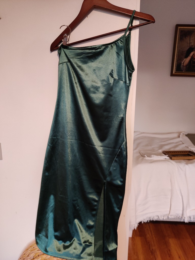 metallinkiiltävä vihreä kotelomekko, yksi säädettävä olkaiminen ja halkio edessä. H&M merkkiä ja koko S. Käyttämätön eli uudenveroinen.