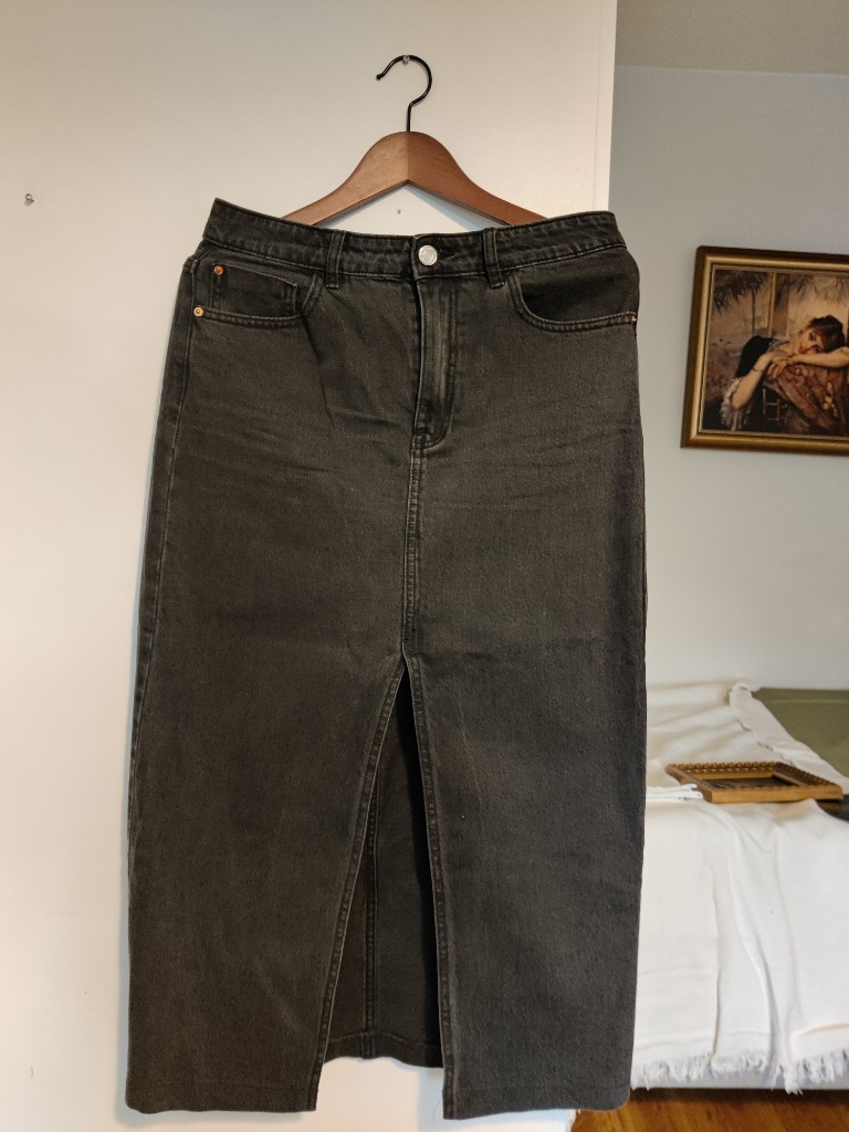Tumman harmaa farkkuhame edessä olevalla halkiolla. Stradivarius merkkiä, koko 40. Käytetty muutamia kertoja ja hyväkuntoinen.