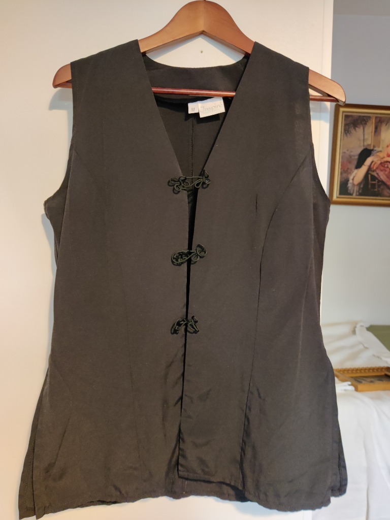 Musta Inspire natural styles merkkinen musta liivi koossa M. edessä napitus kivoilla kukallisilla nyörinapeilla ja alhaalla sivuissa pienet halkiot. Käyttämätön eli uudenveroinen.
