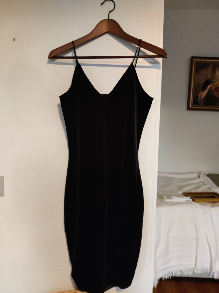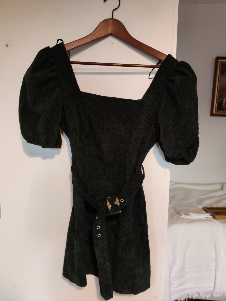 tummanvihreä vakosamettinen Misquided petite-mekko koossa 38. Kerran käytetty ja hyväkuntoinen. Puhvihihat ja vyötäröllä irrotettava vyö ruskealla soljella.